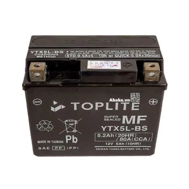 Bình Ắc quy Xe Mô Tô Toplite YTX5L-BS 12V 5Ah – dòng ắc quy AGM kín khí cao cấp, dung lượng 5Ah, sạc nhanh, khởi động mạnh mẽ, an toàn, tuổi thọ cao. Phù hợp cho xe số, tay côn nhỏ, xe mô tô thể thao phân khối nhỏ. Sản phẩm chính hãng Toplite, bảo hành toàn quốc tại Ắc quy Abaka TP.HCM.